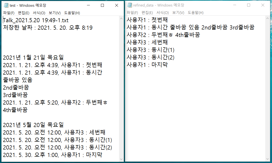 줄바꿈 많은 메세지를 하나로 병합해서 사용자n이 말한 메세지임을 인식할 수 있게 하였다.